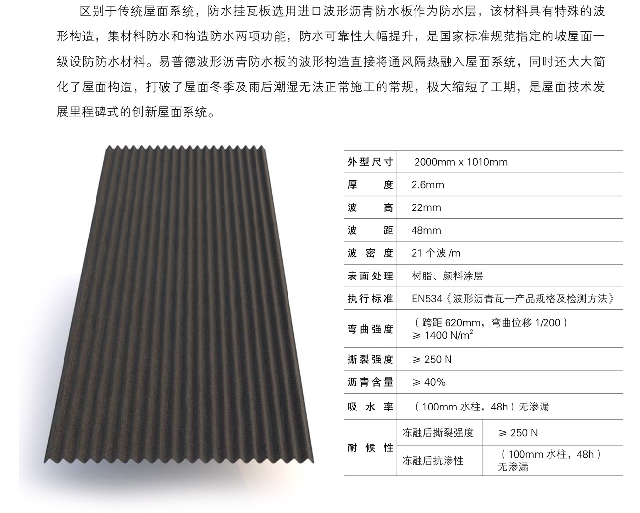 借鑒歐洲坡屋面防水理念,將平面防水改為立體防水,采用新型防水板材料,將材料防水和構造防水于一身,配合屋面系統組件,實現全天候全干作業。節省了屋面各類保護層次,打破了屋面冬季及雨后陰濕無法施工的常規,縮短了工期,提升系統安全性能。